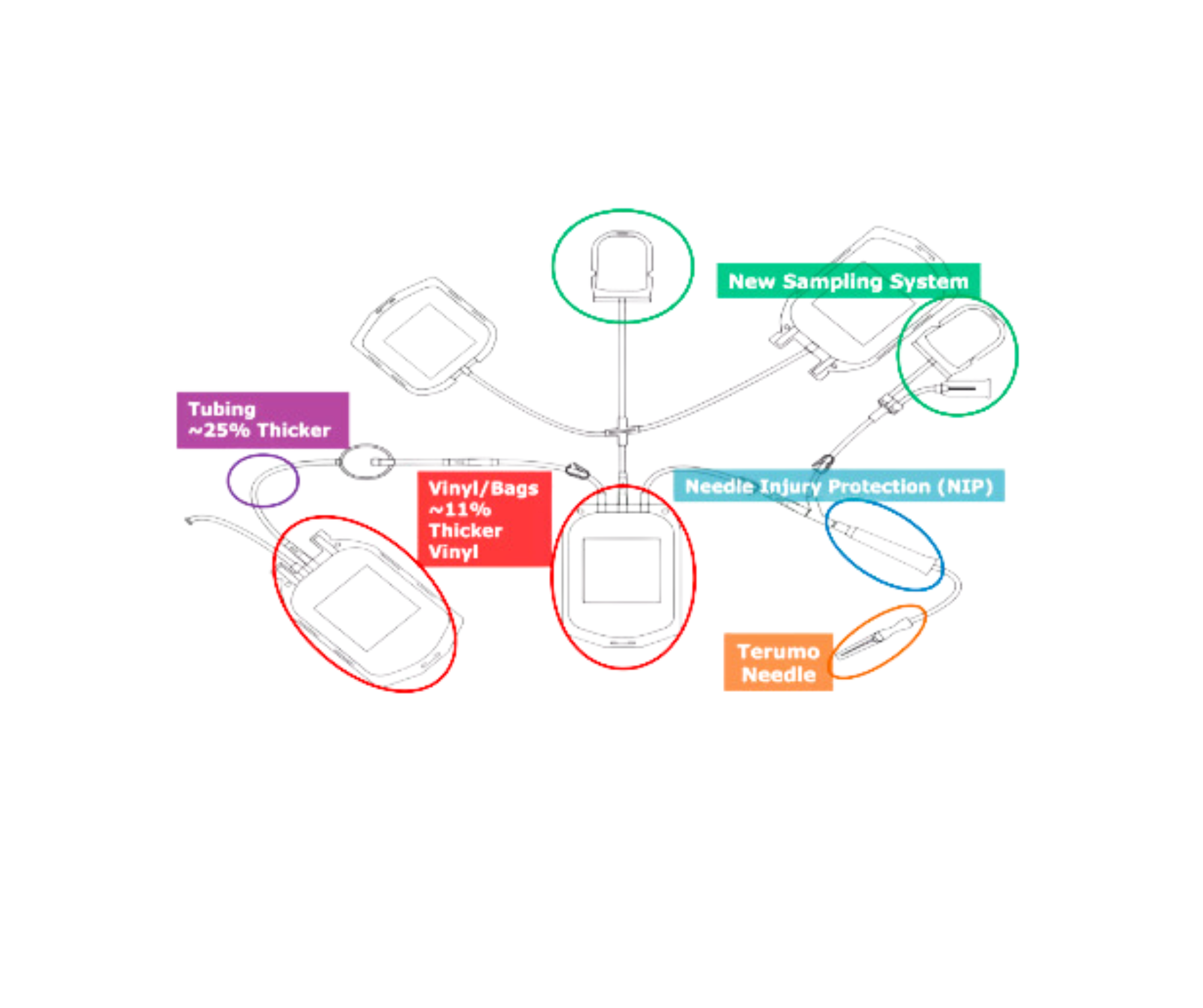 Conjunto de bolsas compatibles con el equipo automatizado REVEOS, diseñadas para recolectar y procesar una unidad de sangre completa. Permiten la separación eficiente de los componentes sanguíneos.