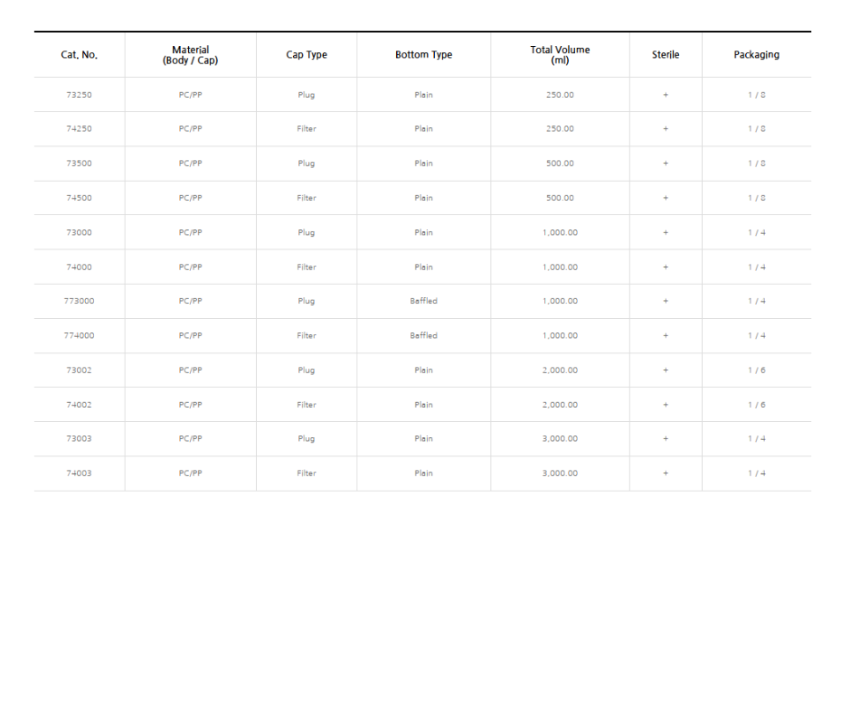 Su diseño facilita una agitación estable, lo que permite una mezcla eficiente de las soluciones. SPL Life Sciences ofrece matraces Erlenmeyer en cinco volúmenes distintos.