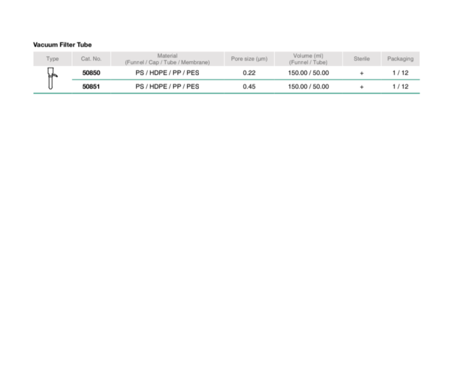 El tubo para filtro de vacío SPL incorpora una membrana hidrofílica de polieter sulfona (PES), que reduce la adsorción de proteínas y otras sustancias, garantizando una excelente durabilidad.