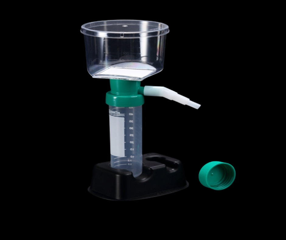 Este diseño permite la recolección directa de muestras al conectarse con un tubo cónico de 50 ml, eliminando la necesidad de transferencias adicionales después de la filtración.